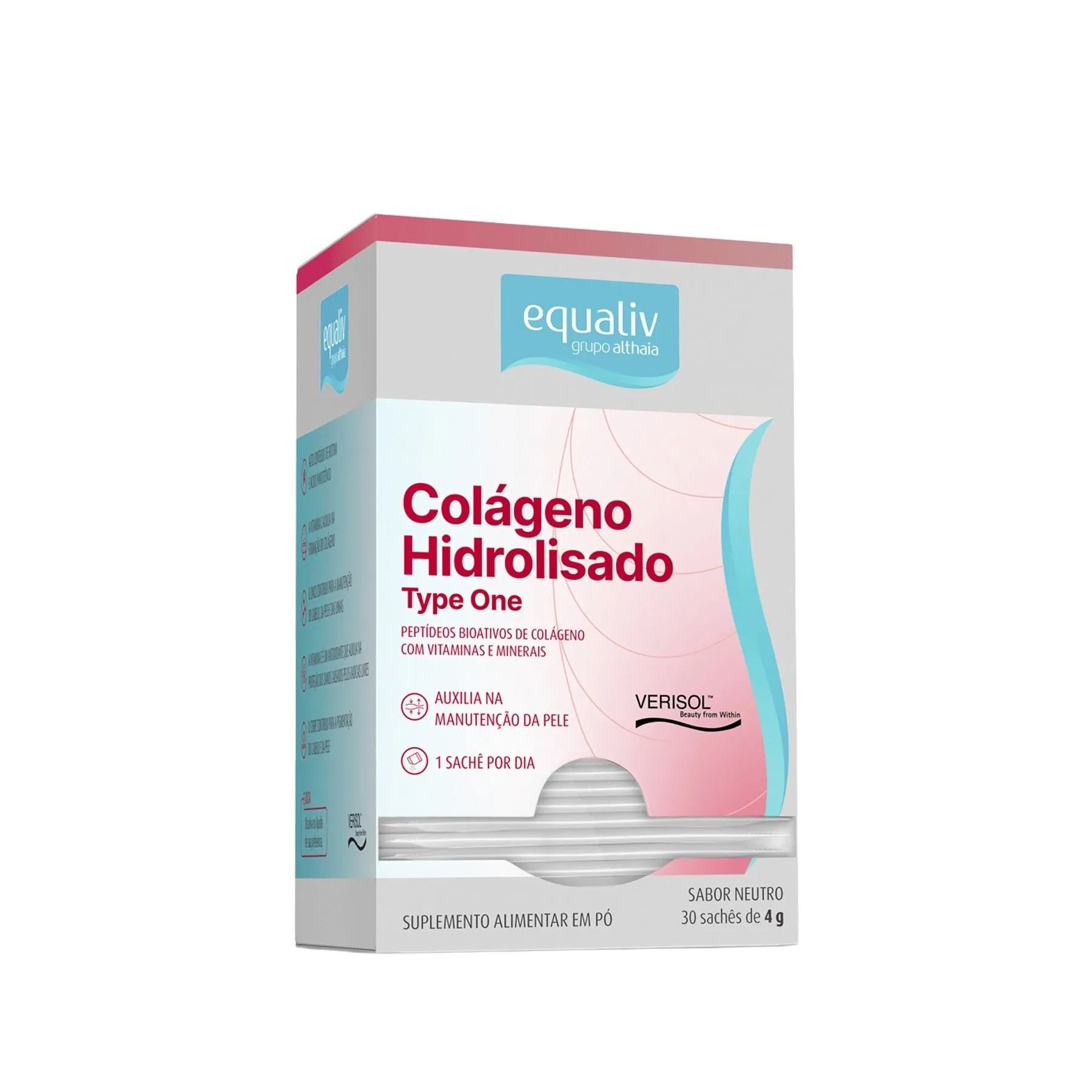Equaliv Type One conta com a revolucionária tecnologia alemã VERISOL®, que concentra em uma menor dose diária, peptídeos biologicamente ativos de colágeno, de sabor neutro, estimulando a produção do colágeno e retardando o processo de envelhecimento. Reproduzindo resultados observados de dentro para fora, denotam 65% de aumento no colágeno na pele, 32% de redução das rugas em áreas próximas aos olhos, entre outros.